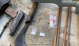 Dalam penggerebekan ini, petugas mengamankan 2 pria yang seorang diantaranya diduga pengedar narkoba, dan menemukan sepucuk pistol rakitan, serta sejumlah senjata tajam beragam jenis.
