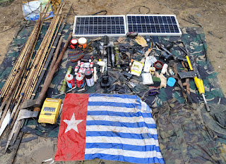 “Dalam kontak Senjata tersebut, pasukan Yudha Sakti berhasil menguasai Markas OPM dan mengamankan berbagai bentuk barang bukti diantaranya 1 Pucuk senpi rakitan, 4 butir Munisi Tajam Kaliber 5.56, 1 buah selongsong, 1 buah Magazen, 1 Helai Bendera Bintang Kejora, 2 buah Solar Sel, 1 buah HP Android, 1 buah HP Poliponik, 1 buah HT berikut Chargernya, 3 buah pilok, 8 buah Senter, 1 buah Peluit, belasan baterai merk ABC, 1 buah Power Sel, berbagai macam dokumen kwitansi, beberapa lembar jimat, belasan busur dan anak panah, bahan makanan serta berbagai macam atribut OPM.