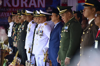 TNI AL, Dispen Kormar Sorong. Komandan Pasmar 3 Brigjen TNI (Mar) Sugianto, S.Sos., M.M., M.Tr.Opsla., menghadiri upacara peringatan Hari Ulang Tahun (HUT) Bhayangkara ke-78 di Alun-alun Aimas, Jl. Sorong-Aimas, Malawili, Kec. Aimas, Kabupaten Sorong, Papua Barat Daya. Senin (01/07/2024).