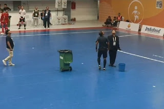 Dalam laga yang berlangsung sekitar pukul 13.00 WIB itu, kedua tim bermain agresif sehingga awal pertandingan saling balas gol dengan skor 1-1. Namun, pertandingan baru berjalan 5 menit. Wasit menghentikan sementara pertandingan dengan kondisi lantai lapangan futsal becek akibat atap GOR bocor.