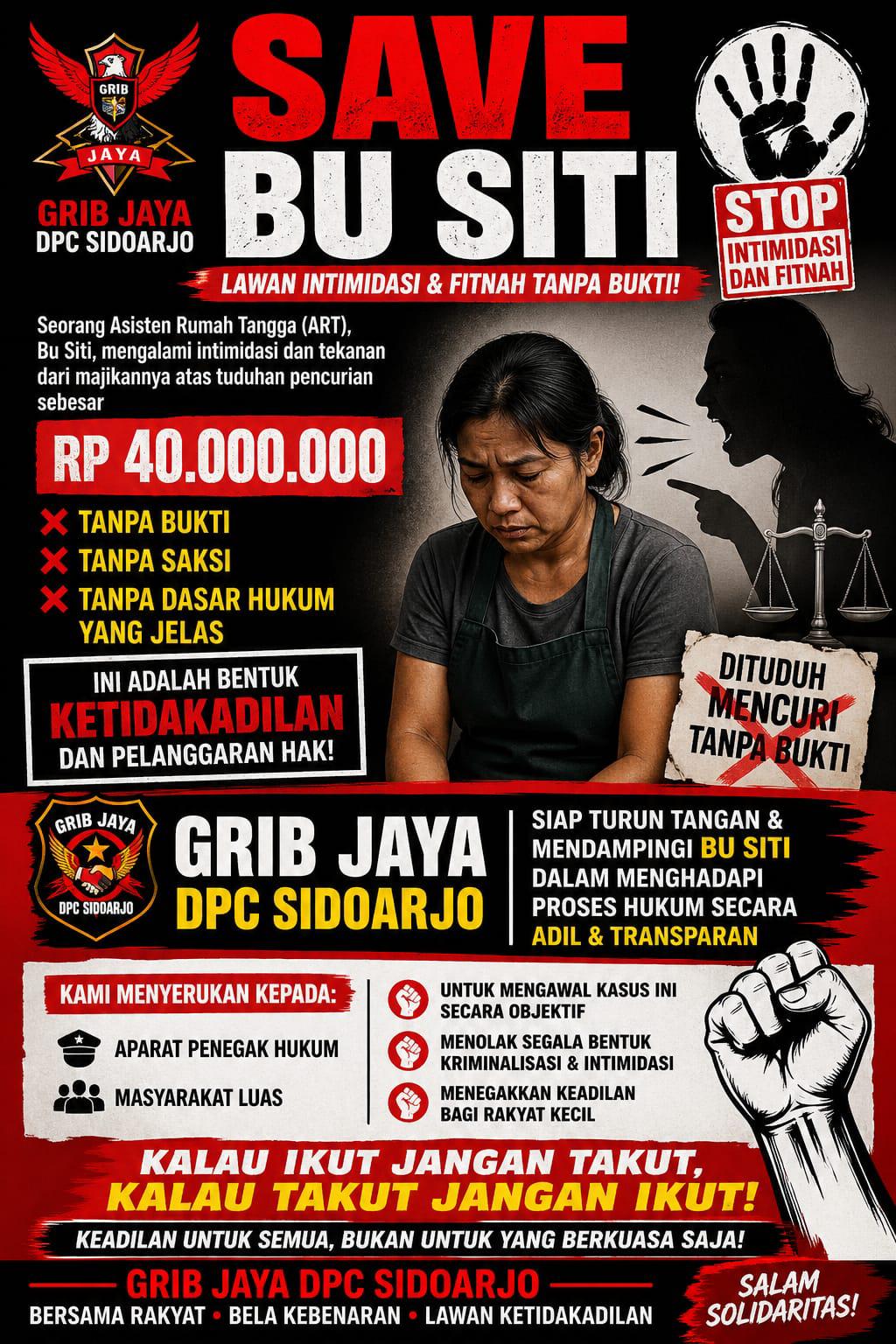 SIDOARJO, Holongpapua.com – Gerakan Rakyat Indonesia Bersatu (GRIB) Jaya DPC Kabupaten Sidoarjo secara resmi menyatakan sikap tegas untuk mengawal kasus dugaan intimidasi dan kriminalisasi yang menimpa seorang Asisten Rumah Tangga (ART) bernama Siti. Kasus ini mencuat ke publik setelah Siti dituduh mencuri uang senilai Rp40 juta oleh majikannya—sebuah tuduhan yang dinilai sepihak dan tidak didasarkan pada minimal dua alat bukti yang sah.